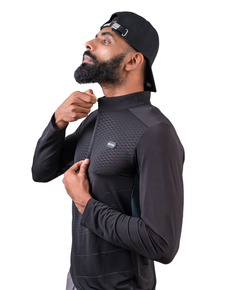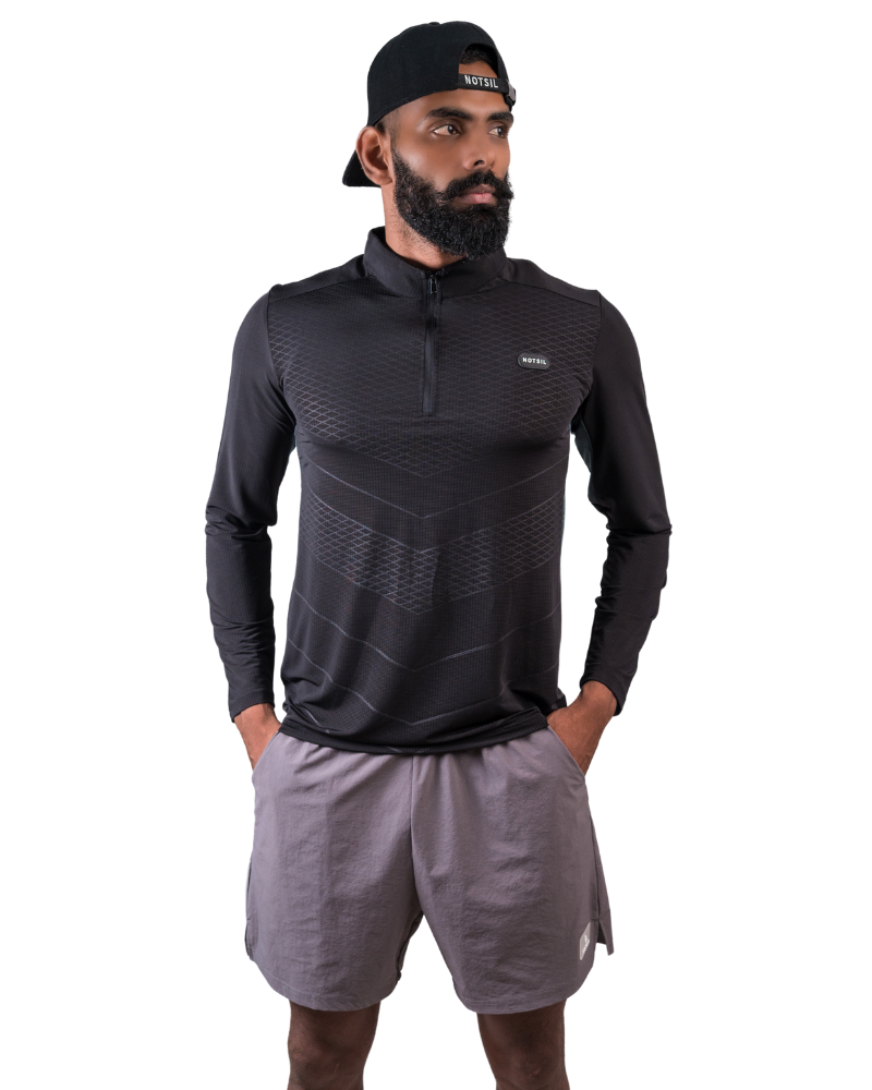 The quarter-zip closure allows easy ventilation, and the subtle geometric pattern adds a modern, technical edge. Finished with the signature Notsil chest logo, this piece combines performance engineering with minimalist design.